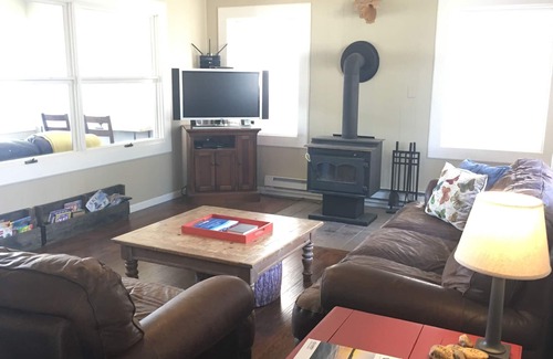 - The Living Room has bay windows overlooking the back yard. It has an leather couch + loveseat, wood-burning stove, and smart TV.