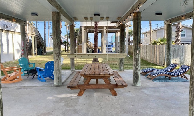 Beach Jewel offers a spacious deck off the main entrance. We've also put together the perfect outdoor oasis. Downstairs you'll find string lights, lounge chairs for tanning, Adirondack rocking chairs for group chats or roasting marshmallows around the fire pit, picnic table for afternoon lunches, and bar height table and swing-chairs for chillin' and relaxin' with a drink while watching the waves. Need I say more?!