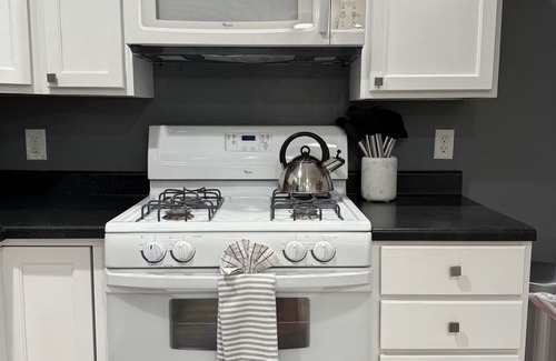 Step inside and be greeted by a tastefully decorated interior that exudes elegance and style. The open concept living area features a cozy queen sleeper sofa, electric fireplace, table for two, coffee bar, and plush bean bag chairs creating a warm and inviting atmosphere. The 65” flat screen TV offers numerous streaming apps of your choice and there is high speed internet/Wi-fi on site. Whether you're cooking a delicious meal on the gas range, reheating your leftovers in the microwave, or simply enjoying a quiet evening, the fully stocked kitchen and full size refrigerator provide everything you need with the comforts of home.