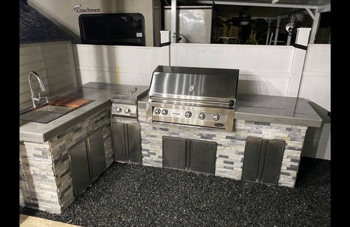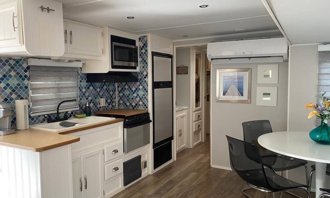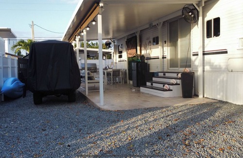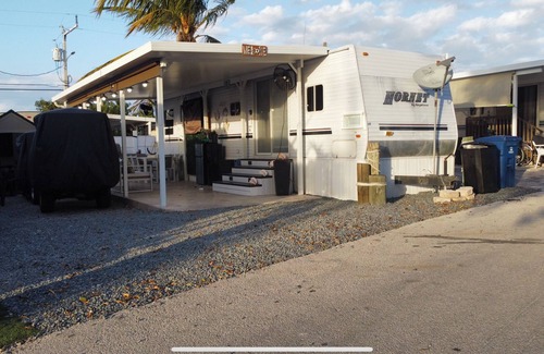 Comfortable mobile home, 2 bedrooms with capacity to sleep 5 plus sofa bed in living area as well. Mobile home is located right across from new bathrooms with showers and laundry room. This property has a huge outdoor kitchen with sink, stoves and bbq. Property also has an insulated porch with fans, 55’ smart TVs and wifi for entertaining. Spacious parking spot for boat, jetski es or 2 cars. Across from this property there are many visitor parking spots for additional guest. As a guest of the property you also get access to all amenities in the campground including the tennis court, basketball court, playground park, pool, sun deck to enjoy the best sunset of the Florida keys and the hammock area in the sand. The property also has available golf cart rental if guess desires at an additional cost per day.