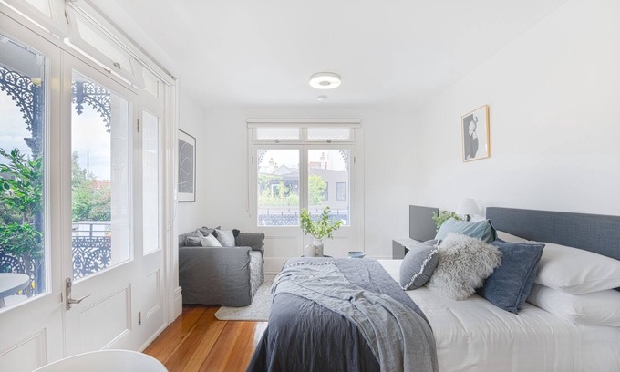 How many studio apartments do you see that have not one, but two Victorian-style wrought iron balconies? How many do you see that have all new furniture and appliances? How many do you see that are light, airy and have views of the surrounding area? This place has all that and more, including a location minutes from transport to the city and a short-walk to the harbour. You can't miss the the foodie paradise of the Tramsheds dining precinct either: it's just across the road.