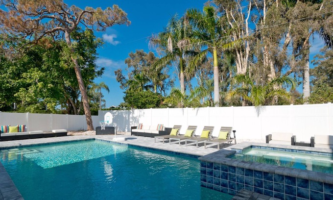 We completely remodeled this awesome Palma Sola Getaway (PSG) house with all the important amenities for your vacation. With 3 master suites and 3 large bedrooms with bunk beds, the Palma Sola Getaway will suit smaller groups that like a wide open, large and luxurious space, or a big extended family getaway. PSG has 14 beds, and we can hold 20 guests depending on sleeping configuration! We have an amazing outside heated pool and spa, complete with a bar and 2 outside TV's. If you are there for the water, we have private water access right across the street for kayaks and paddleboards that we provide. ( Please note this pathway has planking, but it can be wet or even under an inch or two of water after heavy rains and very high tides. Its not recommended for anyone with balance or mobility issues). PSG is a mere 5-7 minutes away from the amazing Gulf beaches on Anna Maria Island, and 1 mile from a very nice tidal beach on Palma Sola Bay that would be great for toddlers.