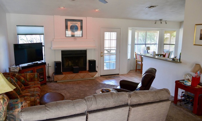 Southwest 3 bedroom/2 bath home with a patio. Great location by the 101 and 51 freeways. Bonus digital work office with monitors, Wi-Fi, printer and more. Spacious master bedroom w/ King bed includes en-suite bath and shower. Second bedroom features a queen bed. 2nd full bath & shower and a 3rd bedroom with a single/double bed. Flat screen TV's in master bedroom and LR. Covered patio & BBQ grill. Air conditioning and wood burning fireplace. Large new refrigerator and washer & dryer included. Enclosed garage.