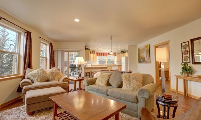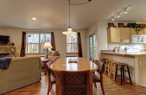 This beautiful condo, located in Frisco with wooded mountain views, is the perfect place to start your next adventure. It offers an excellent balance of comfort and exciting amenities for you and your guests to enjoy. May your days be filled with joy, adventure, and relaxation in this beautiful space. In this two-bedroom unit, the master bedroom features a king bed with an ensuite bathroom and double sinks. The second bedroom has two sets of bunk beds, which is a perfect setup for children and extra guests! The living space boasts an open-concept feel, allowing those cooking in the beautifully equipped kitchen to stay connected with those in the living area.