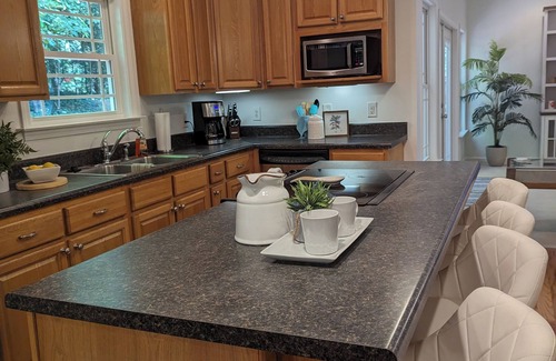 This professionally decorated 4 bedroom, 3.5 bath home boasts a spacious interior with an open floor plan; perfect for gatherings, a private-fenced in back yard for sitting on the deck or playing a game of Clemson corn hole, and a 2-car garage with 2 parking pads for ample guest parking. The main level consists of the master bedroom with ensuite bath featuring a jetted tub, shower, and water closet; and has an outside door leading to the back yard deck to enjoy morning coffee or an afternoon cocktail. The 2nd and 3rd bedrooms share a full bathroom with tub/shower combination. The half bath is conveniently located off the living room. The living room features a 75" smart TV-visible from the open breakfast room and kitchen and is perfect for gatherings. Completing the main level is an oversized laundry room with a brand-new Samsung washer and dryer to use during your stay. The 4th bedroom is conveniently located right off the living room /kitchen area and provides a split bedroom layout-perfect for privacy. This room is large-over 450 sq ft and features a king bed, ensuite bathroom with shower and walk-in closet. There is a designated work area in this room for those who need to "get things done" during your stay with desk, chair, lamp and bookcase. This home is the perfect setup for guests needing space to gather, rooms to rest, an area to get a little work done, and privacy outside for fun, games, grilling and relaxation.