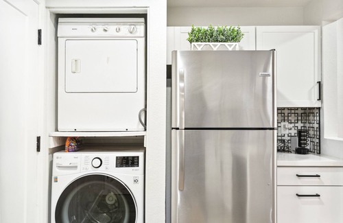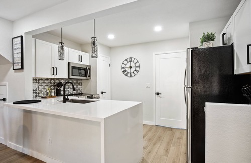 Recently upgraded and beautifully furnished throughout, this spacious and private two-bedroom home features an open floor plan with a modern kitchen, dining area, dedicated workspace, and a living room with 50” Smart TV.