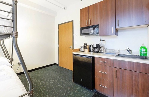 This efficiency suite features a fully-equipped kitchenette and living area. The flooring is carpeted throughout, with ceramic tile in the bathroom. This unit has central heating and cooling that is controlled via a thermostat in the unit. The bed area features a queen over full bed, full-sized desk, reading lamp and USB alarm clock. The bathroom has a beautiful, white tile enclosed shower. The flat screen HD Smart TV (making watching programs like Netflix a snap) is equipped with local channels and HDMI inputs that can be used to connect a computer to view online content.