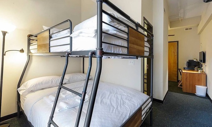 The room comes with a bunk bed that has a full size bed over queen size bed. Its most comfortable for 3 adults but can sleep 4!