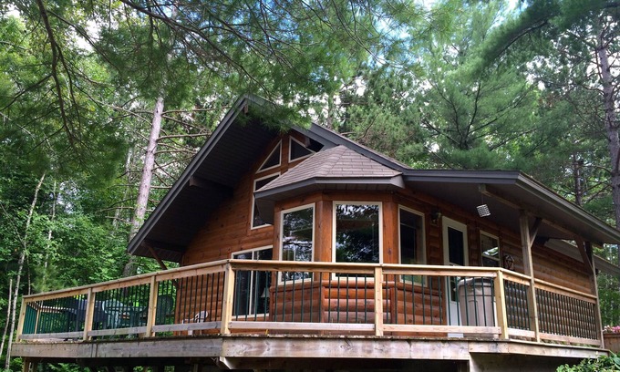 Our cabin has a beautiful view of the lake from the dining room and wrap around deck on the front. We also have a deck off the upstairs bedroom where you can view deer and wildlife in the fields behind. We own 23 acres with trails through our woods for hiking.