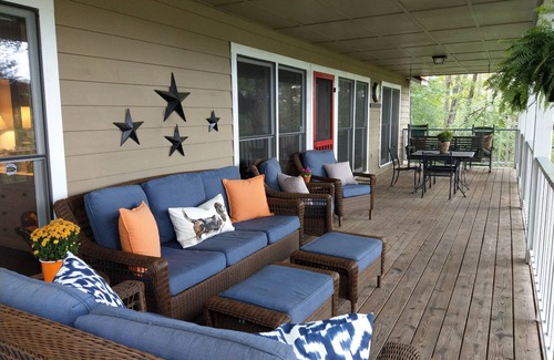 Ferncliff Cottage is truly the ultimate in bringing the outdoors in, tree top and mountain views from all rooms with a full-length covered porch. Flow directly from the Living-Kitchen area onto the covered porch and breathe in the fresh air while lounging on the outdoor sofa, loveseat or club chairs and ottomans. The covered porch also has a porch swing, rocking chair and dining table and chairs.