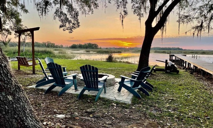 Our private backyard is a shaded haven with sprawling oak trees, perfect for enjoying Florida's natural beauty. Lounge on the covered lanai, roast marshmallows around the fire pit, or fire up the grill for a lakeside BBQ. The Withlacoochee State Trail is just a mile away for adventure lovers, offering 46 miles of scenic biking and hiking trails.