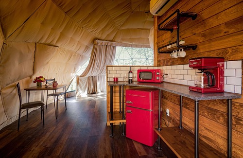 The Peridot geodome boasts a contemporary yet comfortable feel with exposed metal piping, butcher block shelving, pebble shower floor, custom tiling, and more! Peridot has a king-size bed, a small dining table and chairs, a couch, a coffee table that faces the picture window, kitchenettes with retro-style appliances, and custom bathrooms with a glass shower. You can also enjoy the beautiful sights of the forest through the expansive viewing window. Our geodomes are the first in the United States to feature indoor plumbing, HVAC, and electricity, so you're sure to have an experience unlike any other! Unfortunately, children under the age of 12 and pets are prohibited in the Geodomes due to the easily damaged nature of its structure.