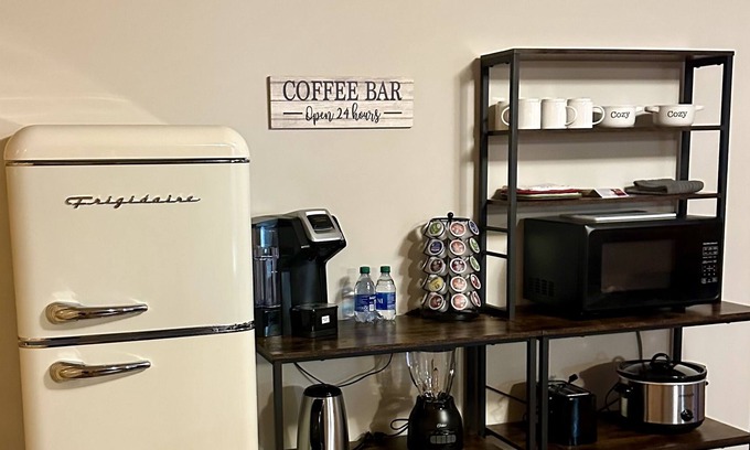 Large great room with entertaining areas, kitchenette, bar, mini fridge and full sized refrigerator, wood burning fireplace, dining/game table area. One large bedroom with king bed and sitting area. Queen sleeper in main room and 3 additional couches. Children and Pet Friendly. Quiet office space with fast internet for remote working. Ample parking and space for parking a boat, jet skis, bikes, kayaks overnight. Private patio for enjoying the summer weather.