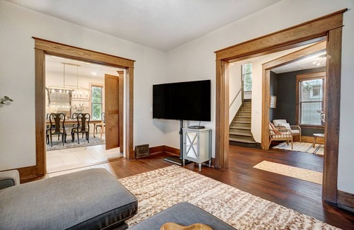unique to its era. On the first floor you will find a spacious living space, dining area, modern