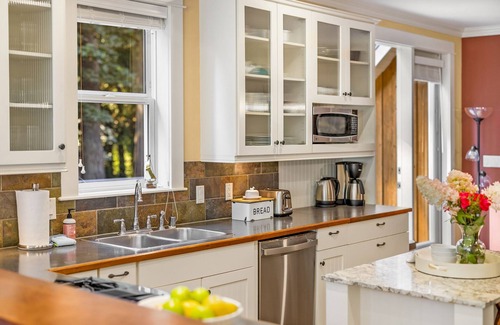 This home features two master bedrooms upstairs (each with queen size beds) with a shared master bath that offers a jetted tub and separate shower. Both rooms have peaceful views of the ravine behind the home. The south bedroom opens onto a private deck which is perfect for a sunny morning coffee. On the main floor is an additional bedroom with two twin sized beds which can be joined to create a king size bed. For long term guests, this room can be converted into a fully functioning home office and is adjacent to a full bath. There is also a powder room bath, laundry room & open great room on the main floor. The living area features large windows with evergreen views overlooking the Fairy Dell ravine. Cozy up to the propane fireplace in the living room on cool mornings & during winter storms. From the dining room and also from the kitchen, French doors lead to a large west facing deck also overlooking the peaceful ravine.