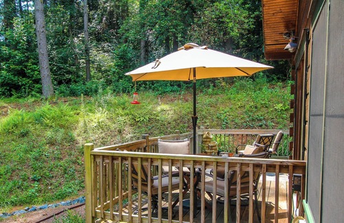 The retreat is close to nature with birds and deer all around the cabin. There are quiet country roads to walk your dog up the mountain or down to the river. No worries if it rains, the front porch is covered and overlooks the trees.