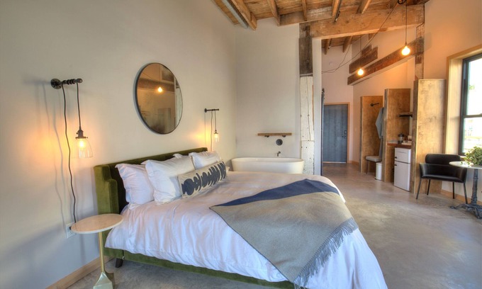 Experience the ultimate in comfort and relaxation as you unwind in our spacious rooms. Sink into sprawling beds, adorned with luxurious sheets, and revel in the inviting ambiance of your fireplace. The locally crafted touches incorporated throughout the room add a distinct charm, while tall ceilings and large windows allow for an abundance of natural light to create an airy and inviting atmosphere.