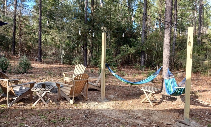 Pets are welcome! Outdoor shower with hot and cold running water, firepit, grill, and comfortable seating - with string lights for a nice warm glow at night.