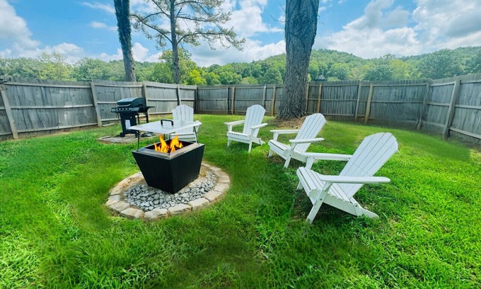 Experience a rustic cabin rental on a spacious, fully fenced pet-friendly property. Perfect for families and friends. The Lake Guntersville vacation rental features a kitchen, living room, open loft space, bedroom, and bathroom with outdoor recreation space.