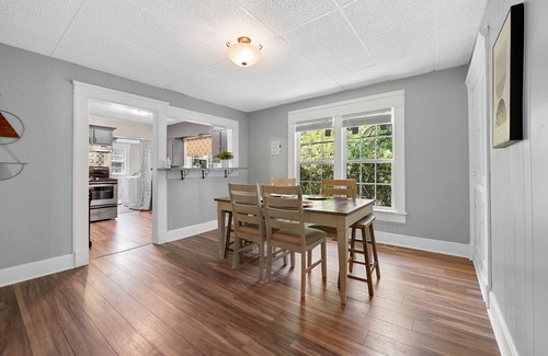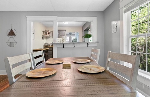Upon arriving you have the option to park on the street or park in the driveway under the carport. You'll enter the property by walking up a couple of small stairs to the front patio, then you'll enter your unique smart lock code on the front door touchpad to enter the house. Ring cameras are installed at all entrances and face outside only. Once you enter the home you'll notice the open layout of the dining and kitchen areas. Each bedroom has a new Zinus mattress and its own dresser and standing fan. There's plenty of room for you and your guests to play board games, watch TV, cook a meal, or socialize. The dining room comfortably seats 4 adults and the kitchen is fully stocked. The house was tastefully decorated with mid-century furniture and eclectic art to enhance the character of the home.
