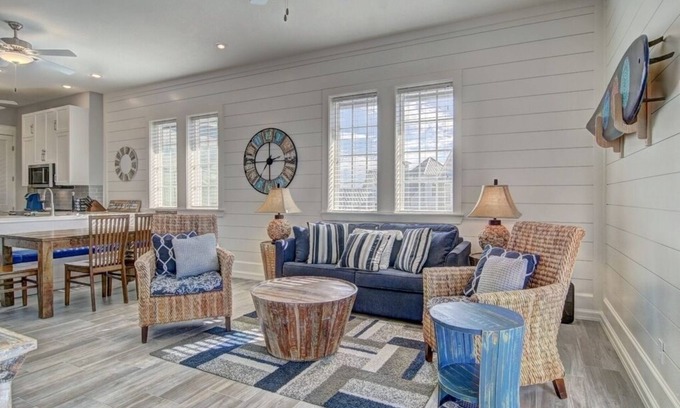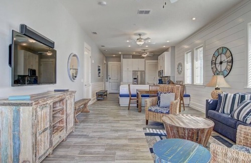 MAIN LIVING SPACE: A stylish, all-white kitchen makes meal prep or snacks after beach time a breeze, with bar stool and banquet seating. The kitchen, fronted by banquet seating and dining table, flows into the den, where blue-and-white, nautical accessories feel beachy and casual. The main living space features shiplap-clad walls for the look and feel of an old, beach cottage, yet you'll have WiFi and all the latest 21st-century necessities. A wall-mounted iPad with Sonos audio soundbar and subwoofer bathes you in surround-sound. It’s an awesome audio experience and great for entertaining or game day TV! Step onto the balcony to enjoy the Town Center view from the bright blue Adirondack chairs.
