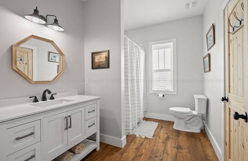 Our one level waterfront cottage features a Master with a queen size bed and a second guest room with 2 full size beds. There is a fully equipped kitchen and 2 full bathrooms. Theres a laundry area tucked into the second bathroom. Rain or shine you can enjoy the lake views under the covered back porch. The lot is sloping with steps down to the swim pier. Enjoy paddle boarding or just floating on the water. There is parking for two vehicles to the side of the cottage. There is a public boat launch just minutes away at Arrowhead Bar & Grill along with dining in a family friendly atmosphere.