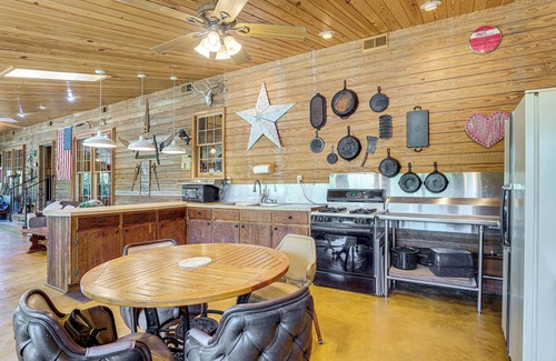 HOME FEATURES: TVs, dining table, ceiling fans, 2 kitchens, multiple dining areas, board games, natural light, rustic interior, fireplace, deck, outdoor seating, hammock, grill