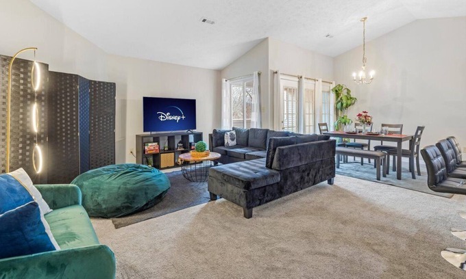You will be welcomed into this peaceful and spacious apartment with local amenities right around the corner! The living room is at the heart of the home with its cozy couches, tall cathedral ceiling, stunning light fixtures, and tasteful design touches. It's the perfect place to wind down after a long day exploring, shopping, or working! Get the popcorn ready and watch your favorite channels on the 58” flat-screen TV offering your favorite streaming apps like Netflix Hulu, Disney+, and Amazon Prime. Use the free high-speed WiFi or simply play a board game! Along with other amenities: