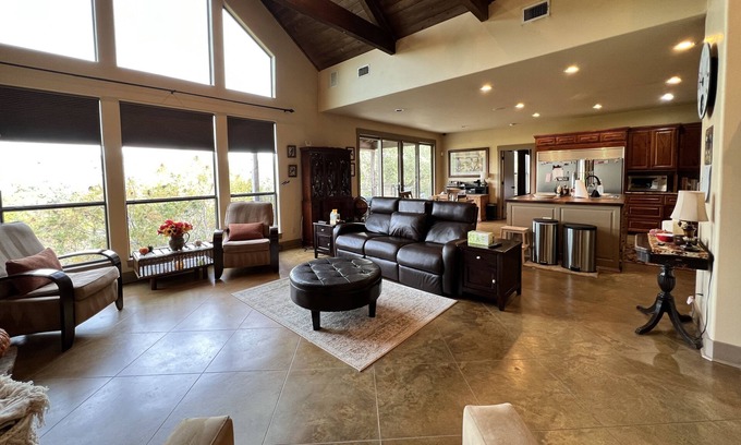 Three-bedroom, two-bath, 2,000 sq ft lodge-style home on the side of a quiet canyon in semi-rural southwest Austin ideal for long term stays. Pet-friendly with a fenced yard and gorgeous views. Minutes away from restaurants, grocery stores, medical care and shopping in Lakeway. Master has a king bed. Guest bedrooms are set up for work from home as complete offices with guest beds.