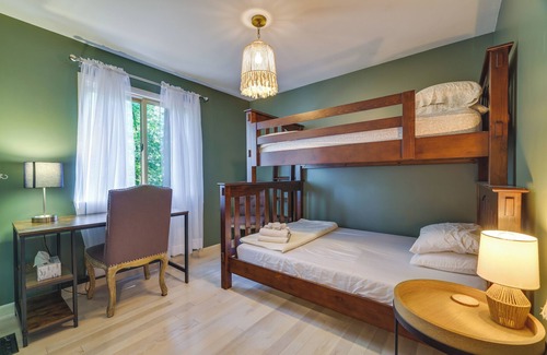 Hit the nearby slopes at Masthope Mountain or explore the Upper Delaware Recreational River when you retreat to this tranquil vacation rental in Lackawaxen, PA. After cooling off in the community pool, return to the cozy cabin and have a cookout on the grill. This 2-bedroom, 1-bathroom property also features a lofted sleeping area, large and scenic gable windows, and multiple fireplaces. At sunset, warm up by the gas fire pit as the kids play on the swings or cuddle with a pet and watch a movie.