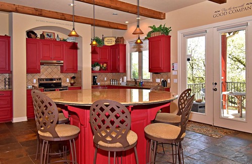 The open-plan kitchen is a space of vibrant, red cabinetry and sleek granite countertops. It is equipped with stainless steel appliances, including a blender, stove, coffee machine, cooking and wine ware, oven and a refrigerator. A round dinner table sits in the center with 8 high chairs, perfect for sundown cocktails or family get-togethers.