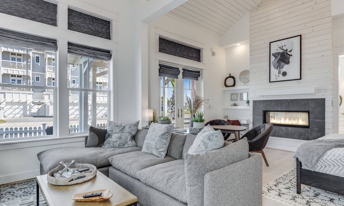 Perfect for two, this brightly colored studio beach cabin offers luxury living with vaulted ceilings, quartz countertops, and a private, covered patio. Large windows surround the space, allowing for plenty of natural light. Curl up on the sumptuous sofa and catch up with your favorite shows on the Smart TV.