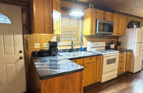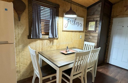 Upon arrival, guests will notice the charming character of this cabin with front for sipping morning coffee or enjoy outside time during a spring storm. Guests will walk into this unique Hocking Hills Cabin to a beautiful, quaint living room and fully equipped kitchen. The 2 bedrooms offer a place for our customers to “hit the hay” after a day of exploring all the nearby state parks. A small porch, that sits off the kitchen, is a great place for some peace and quiet – catch up on one of your favorite books or unwind with some local brews or wine!