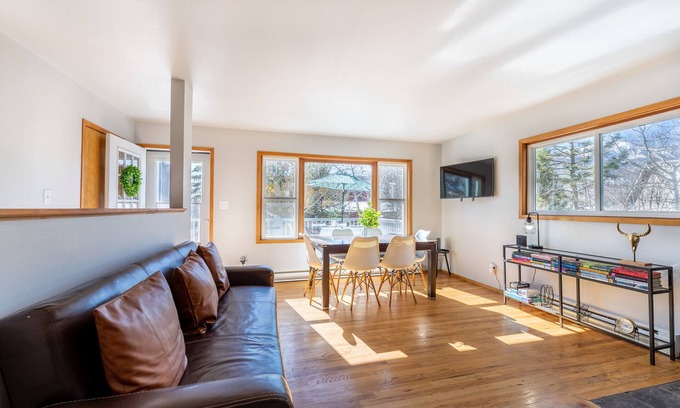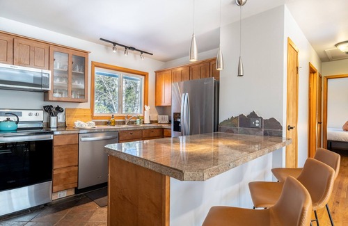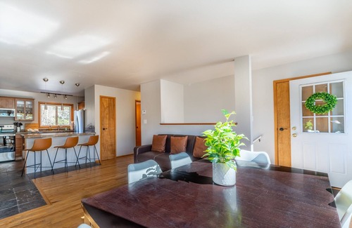 The sunny main level features an open floor plan with a fully-stocked, updated kitchen, living area with flat-screen Smart TV, and a dining space that seats 6 (a leaf is provided, for the option of seating 8). Three additional guests can sit at the breakfast bar. Take in the views from the leather sofa or relax with a book while you watch the snow fall. Guests can easily access the private deck and backyard behind the dining area. The deck overlooks the backyard and offers outdoor seating.