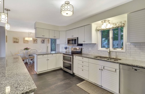 Heading upstairs, you will enter an open concept family room with access to the wrap around deck and sunroom. The kitchen is a host's dream with plenty of counter space for entertaining. Barstool seating is available off of the kitchen, with additional seating in two separate dining areas, accommodating up to 10 guests in total. Lastly, you'll find the guest rooms and second master bedroom. The first guest bedroom features a full size bed, while the second room features a full size bed and a twin/full bunk bed - perfect for the little ones! The master bedroom features the second king bed and the shared full bathroom is complete with a double vanity and bathtub.