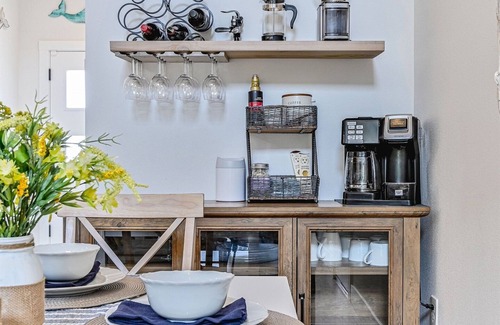 The soaring ceilings in the great room and a double sliding glass door to a large covered back patio allows for all of the natural light to shine in even on rainy days. The fully equipped kitchen and coffee bar have all you need to make your favorite meals. Large dining table can be further extended for more room. Master bedroom has king bed and an attached bathroom (full sized stand up shower), and a slider to the back patio. The 2nd bedroom has a full size bed with twin bunk bed on top, and a twin sized trundle pullout. Sit by the fire pit in the backyard, or play cornhole as you watch boats glide by. Beach towels, beach chairs, umbrella, and sand toys available. Washer and dryer.