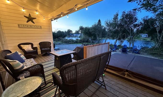 A - Beautifully appointed brand new 2bedroom 2 bath duplex is peaceful beach escape to bring you and your loved ones together. Just a few steps off the back patio is the Grand Canal which has 23 miles of interconnected waterways. Feel your muscles relax as you soak in the private hot tub and watch the rippling water of the canal. Roast marshmallows around the fire pit surrounded with adirondack chairs, build sand castles with your kids in the backyard, or sip coffee with a comfy blanket at gas fire pit on the covered back patio. If you are wanting adventures, just grab the provided beach chairs, beach blanket, cooler and umbrella and head to the beach. Damon Point is just a 1/2 mile away and the perfect place to find shells, splash in the waves, or read your favorite book. Shore Thing is also a quick 7-10 minute drive to the North Jetty, as well as the drive-on beach which is perfect to watch the sunset. Oyhut Bay Resort is an easy walk or quick drive with a coffee shop, playground, Oyhut Grill, and bar. Enjoyment is a Shore Thing.