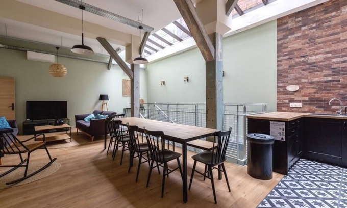 That beautiful loft for 12 people, located on the ground floor of a quiet courtyard building, has been designed in an industrial and wood style.