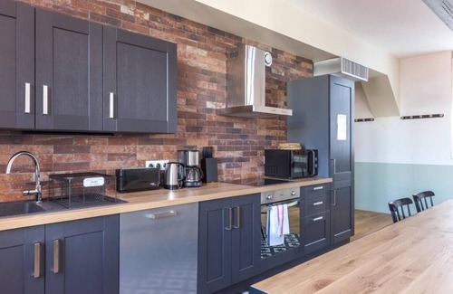 The apartment has everything you need to cook and eat for a group : Dishwasher, fridge, 4 burner stove, oven, coffee machine, boiler, microwave oven, toaster, plates, cutlery, glasses, mugs, bowls, stoves, pans …