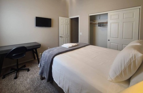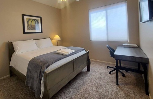 Master bedroom has a king size bed, the other 3 rooms have a Queen size beds. All bedrooms have a full size desk. Internet speed is 100 mbps. Three rooms have a walk in closet, all bathroom comes with a shower and tub. Our place is located less than 2 miles from hiking and biking trails. Less than 2 miles from Aguila Golf Course. We are 9 miles from Sky Harbor Airport, 7.6 miles form ASU Downtown campus. We are also about 11 miles from Grand Canyon University and 12 miles to ASU main campus.