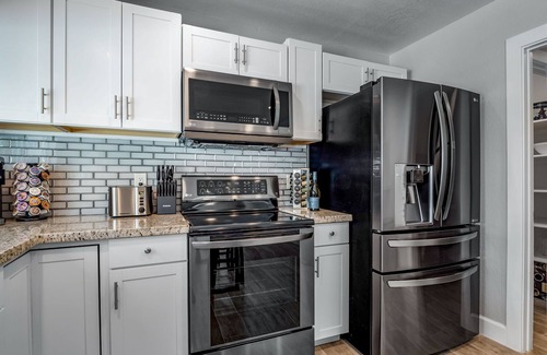 The fully equipped kitchen is perfect for preparing meals, complete with stainless steel appliances, an island with extra seating, and all the cooking essentials you need to make or serve meals for you and your guests.