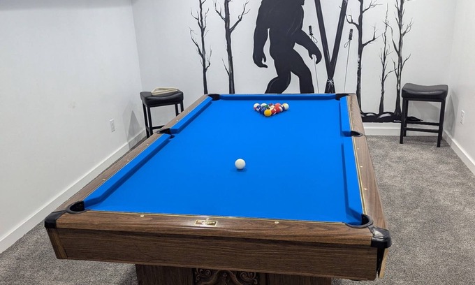The upstairs boasts 3 bedrooms, a full bathroom, full kitchen, large living room with an 80" television and a dining room that seats 6. The downstairs has a queen bed and a bunk with a queen floor mattress and a twin top bunk. There is a television, Xbox, pool table, and basketball game. The home is walking distance to the gondola and waterpark . Snowmobiling 30 minutes away. We have a finished basement with beds, games, and pool table. The house is very comfortable and has lots of room.