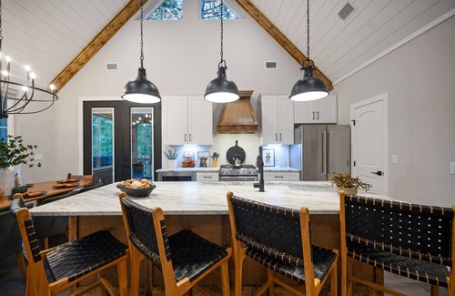 Step outside to immerse yourself in nature with Lazy River Retreat's stunning outdoor amenities. Enjoy evenings around the firepit, roast marshmallows under the stars, or unwind in the hot tub while taking in the peaceful surroundings. The outdoor seating area is perfect for morning coffee or alfresco dining. Inside, the cabin’s full kitchen boasts sleek quartz countertops and modern appliances, perfect for preparing meals for your group. Whether you’re seeking adventure in the great outdoors or looking for a quiet retreat, Lazy River Retreat offers the ideal balance of comfort, luxury, and natural beauty for your next getaway.