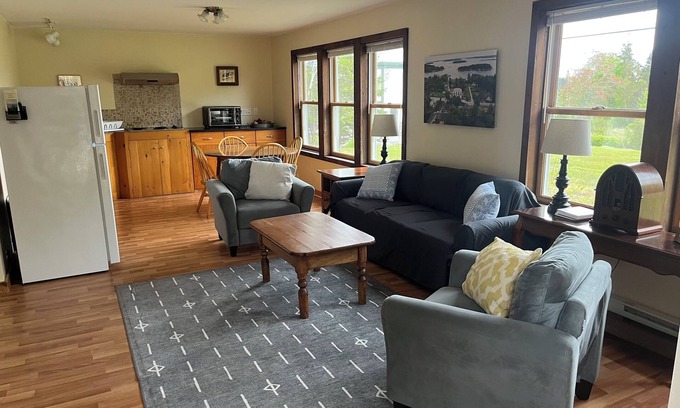 The Pickwick is a small, conveniently-located, pet-friendly house just outside of the quiet village of Brooklin, known worldwide for Brooklin Boat Yard and Wooden Boat School and Magazine. This two bedroom, one bath house sleeps 4 and is within walking distance of the ocean and center of town where you will find the Brooklin General Store, Friend Memorial Library and unique little shops, and just 16 miles from Blue Hill Village, the larger town at the head of the peninsula. The surrounding area offers many options for hiking, bird watching, kayaking, etc. Please note: This is a 2 unit property and the right side is closed off for owner storage. There is not a full-sized oven. There is a countertop model and separate microwave.