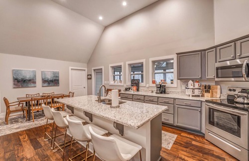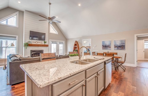 Hot Tub, outdoor tv, Beautiful woodland cottage with a relaxing coastal interior, fabulous vacation escape just 5 minutes to Pickwick Lake. Open, airy floorpan with giant island overlooking Greatroom with fireplace.
