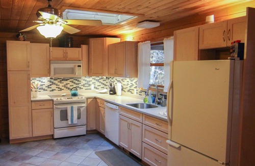 Enjoy the perfect getaway and experience true Maine living in our quiet log cabin located only about 10-15 minutes from downtown Bar Harbor and even closer to the entrance of Acadia National Park. Our well-appointed, fully air-conditioned home, features a spacious living room, bright kitchen, 3 bedrooms (a king bed, one queen bed, and two twin beds) and 2 bathrooms. As you drive up to our property on our newly paved driveway, you are greeted by a welcoming farmer's porch. The main floor includes the living room, fully-equipped kitchen, two bedrooms and a full bath. The lower level includes the master bedroom with king bed, bathroom and shower. This lower level has a door to the outside, and each room throughout the house includes ceiling fans that keep everything very cool, even in the summer months. Air conditioning is available in every room. Also we have a charcoal grill, Google Home to stream music, wireless high-speed Internet throughout the whole house, a picnic table, as well as a washer/dryer.