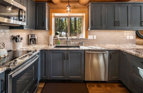 Just off the great room is the over-sized entertainment deck with plenty of comfortable seating and a gas fire table. From the deck you can watch the kids play horseshoes or throw the frisbee on the massive lawn area. The lower level of the cabin is a great spot for entertaining with an air hockey table, and large wet bar for the adults to enjoy!