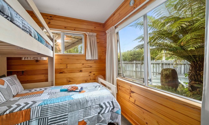 With wrap-around decking and a spa pool, this cosy hideaway is just a short stroll to the Tongariro River! Welcome to Piece of Paradise.
