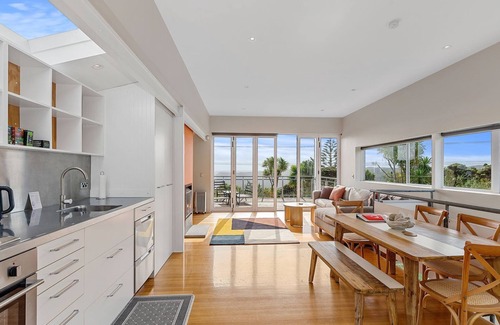 Contemporary two-bedroom home, immaculately presented with panoramic ocean views, gorgeous in-ground pool and surrounded by lush native bush, offering peaceful and private living. Only 5 minutes' drive from the beach, with open plan living, and a glass wall opening up the stunning coastal view. Enjoy waking up and taking in the glorious viewscape with a freshly brewed coffee. The expansive lawn area provides for kids to play and family to picnic. Plenty of off-street parking with room for a boat or caravan. Open plan great room living upstairs with lovely solid oak flooring and kitchen, dining, living and office areas. Natural light from all four sides makes you feel integrated with the beautiful natural environment surrounding you including tuis that you might see feeding on berries beside the deck. Two bedrooms downstairs with queen beds.