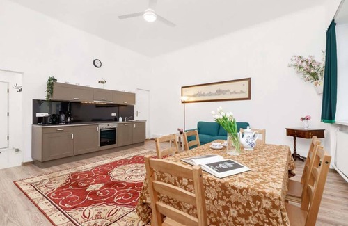 The apartment can accommodate up to 6 people and consists of a living room with a kitchenette, three bedrooms and two bathrooms - with a bathtub and a shower. The space of the apartment has been designed in a beautiful, old style combined with modern functionality, including both large, spacious, double beds in the bedrooms, as well as a relaxation area with a comfortable sofa and flat Tv in the living room. The kitchenette and bathroom are fully equipped so you can feel really at home. Guests have at their disposal appliances such as an oven, coffee machine, dishwasher and washing machine.